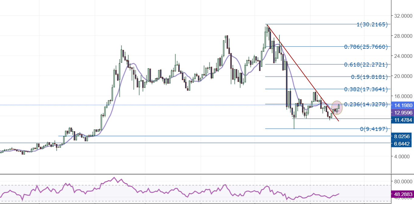 Günlük grafikte beliren düşüş trendini kıran ATOM/USD 9MA’dan pozitif ayrışmasıyla birlikte hacmini artırdı. Halihazırda 14,32 seviyesini test eden kripto para biriminde alıcılar gücünü koruyabilirse 17 ve 19,80 seviyesine kadar ivme yakalanabilir.