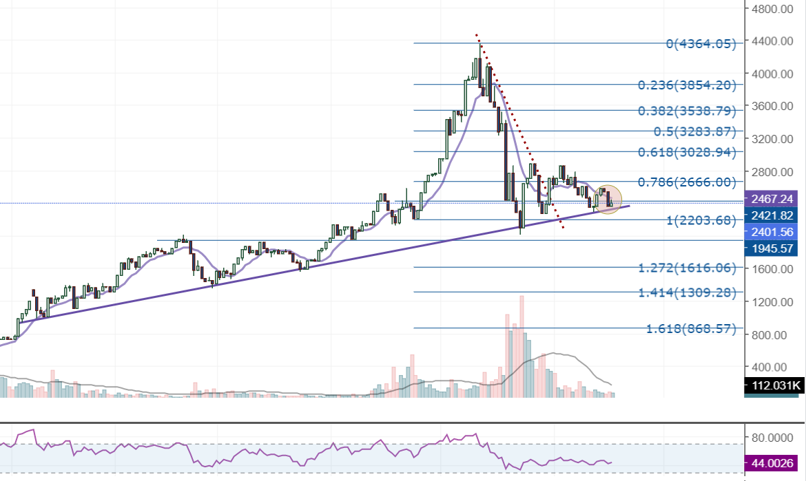 Yaşanan stres sonrası günlük grafikte oluşturduğu yükselen trendin destek bölgesini test eden ETH/USD paritesi 2.400 direnciyle olan mücadelesini sürdürüyor.