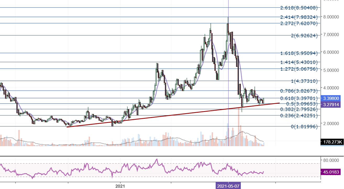 Günlük grafikte çanak formasyonu hedefini tamamlamasının ardından 7,62 direncini test ederek yaklaşık yüzde 40 değer kaybı yaşayan XTZ/USD sonraki süreçte “V” toparlanma sürecine girmişti. 7 Mayıs’tan itibaren yeniden satış dalgasına giren kripto para birimi aşırı satım bölgesinden henüz çıkabilmiş değil.