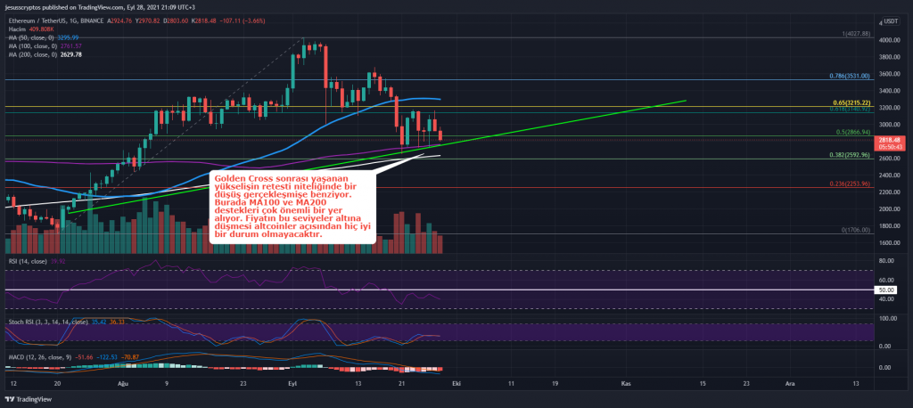 4.000 dolar civarından yaşadığı %30’un üzerindeki düşüşle 100 günlük hareketli ortalama olan 2.761 dolar seviyelerine kadar gerileyen ETH, MA100 seviyesini halen koruyor. BTC’deki düşüşün etkisi görülen ETH için MA100 ve MA200 (2.629 Dolar) seviyelerinin yanı sıra yeşil yükseliş trendi de oldukça önemli bir destek görevi görüyor.