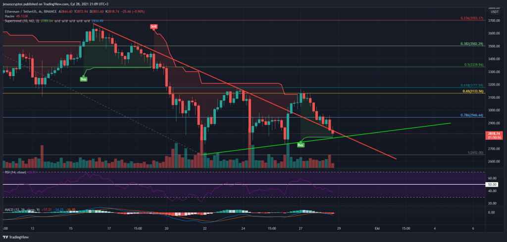 Günlük grafikte de önemli destek seviyeleri ve trend çizgisi üzerinde bulunan ETH, 4 saatlik zaman diliminde de hem yeşil trend desteğinin hem de Süper Trend indikatörünün AL sinyali verdiği destek üzerine alıcı buluyor.