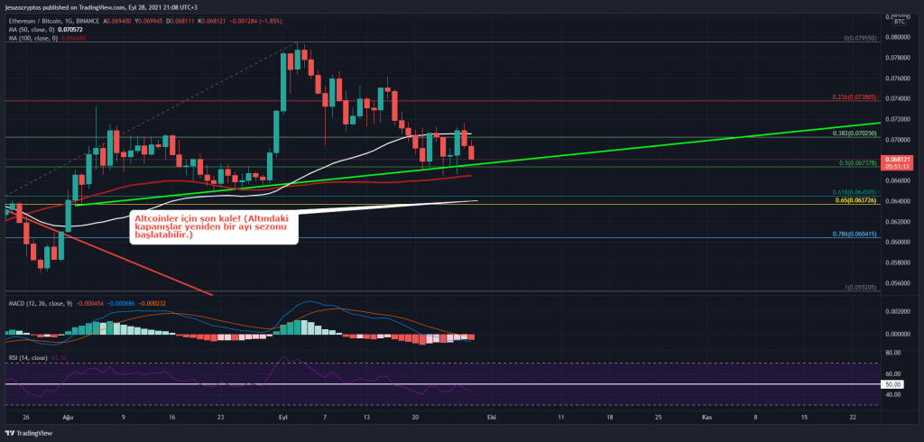 Grafikteki 0,0673 seviyesinin kaybedilmesi halinde pariteyi MA100’e denk gelen 0,06648 seviyesinin karşılaması bekleniyor. Bu seviyenin de kaybedilmesi altcoinlerin kaderi için son kale olan 0,0637 – 0,0645 aralığını gündeme getirebilir. Bu seviyeler bir bir kaybedilirse piyasada yeniden zorlu bir ayı sezonunun başladığı görülebilir.