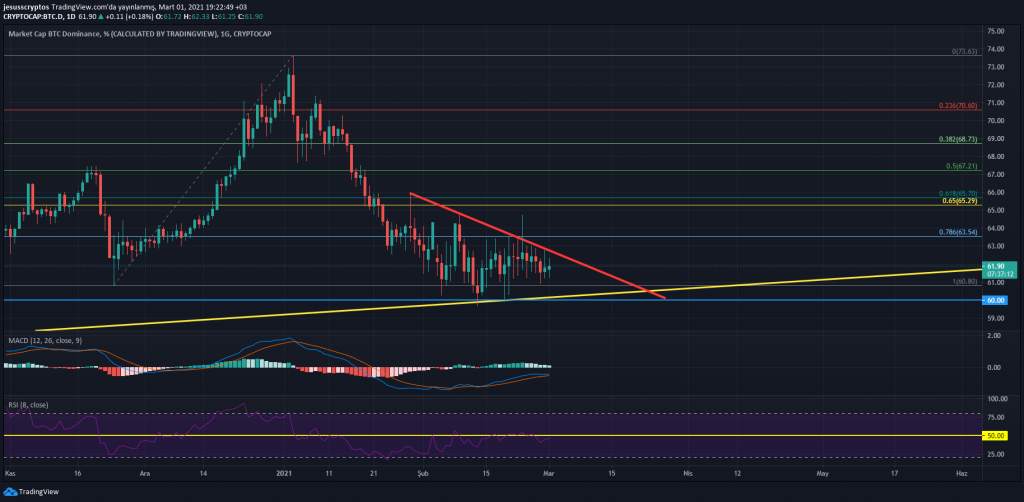 Günlük grafikte sarı trend çizgisinden dönen Dominance, kritik seviye olan %60’ın üzerinde seyrediyor. Ayrıca kırmızı trend çizgisi ile oluşturulan direnç alanının da sonuna yaklaşan grafik, önümüzdeki günlerde altcoinlerin kaderini belirleyeceğe benziyor.