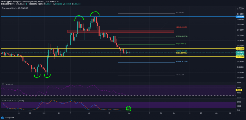 Günlük açıdan bu grafiği incelediğimizdeyse piyasanın önemli bir karar verme aşamasında olduğu görülüyor. ETH’nin BTC’ye karşı değerlenmesi ve 0.33 BTC üzerine çıkması halinde altcoinlerde de ciddi yükselişler görülebilir. StcohRSI indikatörünün AL sinyali oluşturması da bu yükseliş zamanının yaklaştığını işaret ediyor.