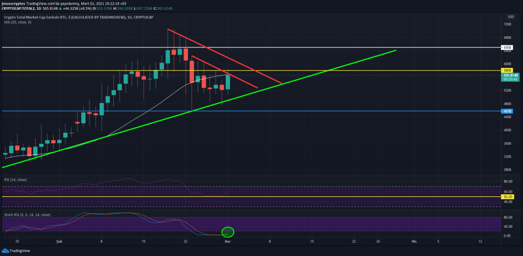 Total2 tablosunu günlük açıdan incelediğimizde 22 Ocak’tan bu yana gelen yeşil yükselen trend çizgisinden kuvvet aldığı görülüyor. Ancak grafik hâlâ 20 günlük hareketli ortalama altında kalıyor. Altcoin yatırımcılarının beklentisi ise önemli bir seviye olan 580 milyar doların üzerine çıkılması ve altcoinlerin hızla fiyatlanması olarak belirtiliyor.