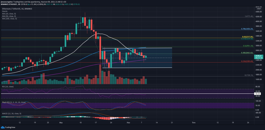 Yaklaşık olarak 2080 – 3000 dolar aralığında paralel kanal içerisinde konsolide olduğu görülen ETH, aynı zamanda MA100 seviyesi olan 2421 dolar ve MA50’ye denk gelen 2927 dolar arasında gidip geliyor. Ayrıca trend açısından önemli olduğu bilinen MA20 (2575 Dolar) seviyesi üzerinde kalmaya çalışan ETH fiyatının giderek sıkıştığı belirtiliyor.