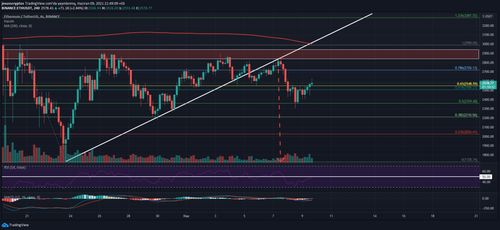 Uygulanan fibonacci düzeltmesi açısından önemli bulunan 2508 – 2548 dolar aralığı üzerine mum kapanışı yapmayı başaran ETH’nin bu bölgeyi desteğe çevirdiği ve bir sonraki dirence doğru ilerlediği görülüyor. Yükselen üçgenin de direnç alanı olan 2840 – 2940 dolar aralığına doğru ilerleyen ETH’nin önündeki tek ara direncin 2720 dolar olduğu belirtiliyor.