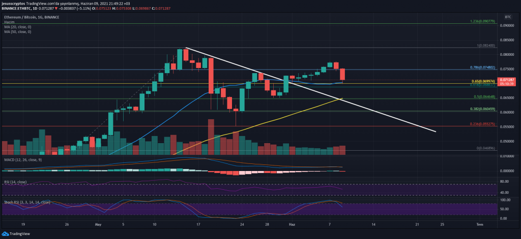 Ancak en başta da bahsettiğimiz üzere bugünkü BTC yükselişinde ETH sahneyi BTC’ye bıraktı. Bunun sonucu olarak ETH/BTC paritesinde düşüş BTC hakimiyetinde de yükseliş görülürken BTC’nin altcoinleri ezdiğine şahit oluyoruz. ETH/BTC paritesi günlü açıdan incelendiğindeyse bu düşüşün MA20 seviyesi ve önemli destek alanı tarafından duraklatıldığı görülüyor.