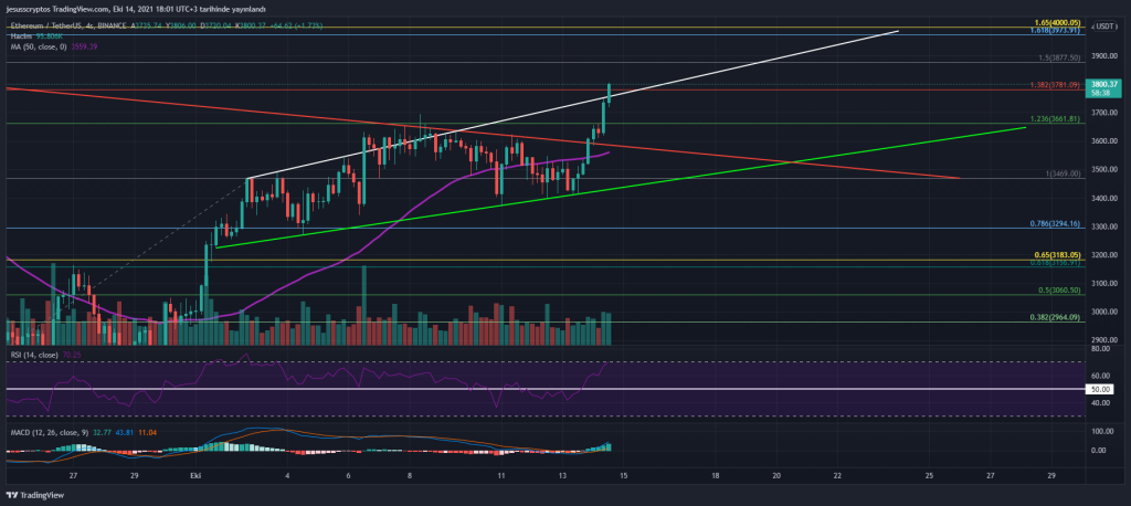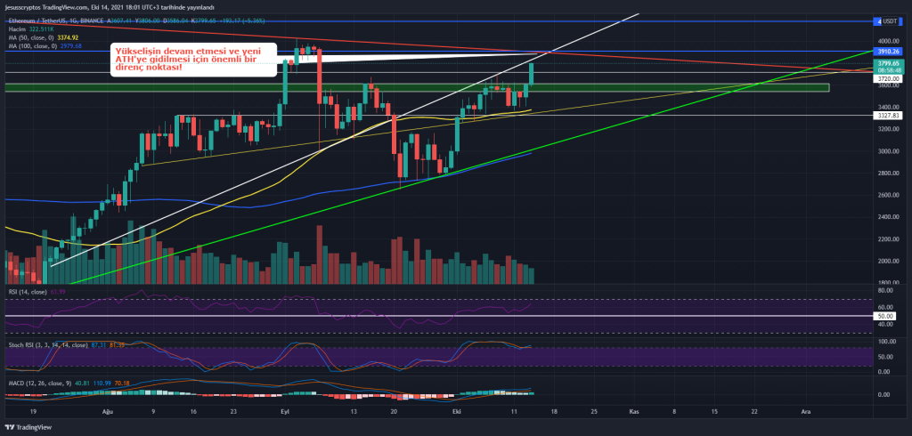 Eylül ayındaki zirve seviyeden gelen kırmızı düşüş trendini de bu yükselişle kıran ETH, beyaz trend çizgisi üzerinde kalmaya çalışıyor. Aynı zamanda yatayda önemli olan 3.781 doları destek haline getirmeye çalıştığı düşünülen ETH, iki mum üst üste bu seviye üzerinde kapatırsa 3.877 dolara doğru yükselebilir. Bu noktada yükseliş trendinin ilk önemli direnç alanının 3.973 – 4.000 dolar aralığı olduğu belirtiliyor.