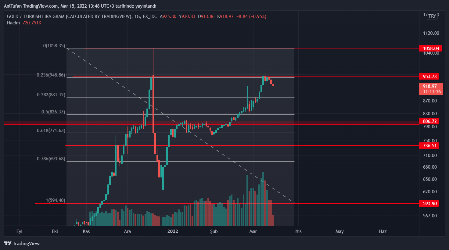 Bugün itibariyle 918 Türk lirası seviyelerine kadar gerilemiş olan Gram altın, ilerleyen günlerde fibonacci 0.382 seviyesi olan 880 Türk lirası desteğine bir geri çekilme gerçekleştirebilir.