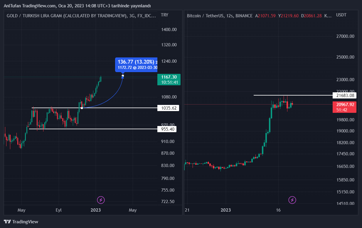 Gram altındaki yükseliş trendi 1.035 Türk lirası seviyesindeki zirvenin kırılımı ve retestinin başarılı bir şekilde gerçekleştirilmesinin ardından başladı. Bu sürecin ardından gram altının bugün itibariyle 1.167 Türk lirası seviyelerine yükseldiği net bir şekilde görülmekte.