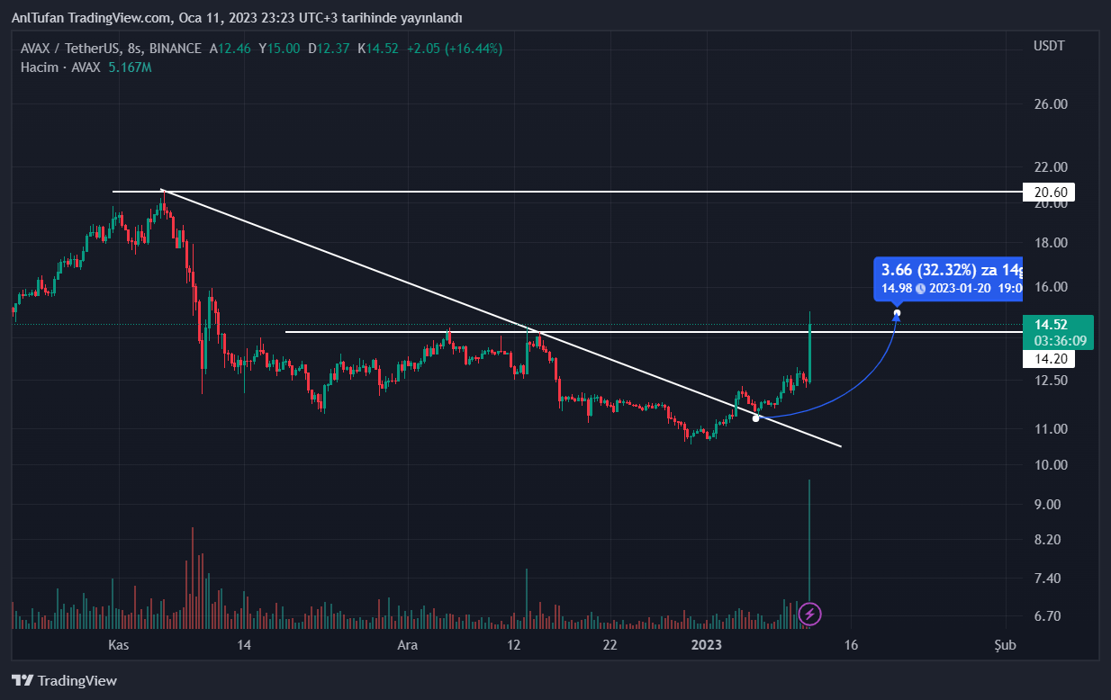 Bu yükselişlerin hızlanmasını sağlayan Amazon ortaklığı, şuan itibariyle AVAX’ın kritik bir direnç seviyesi olan 14.20 dolar direncini de aşmasını sağlamış durumda.