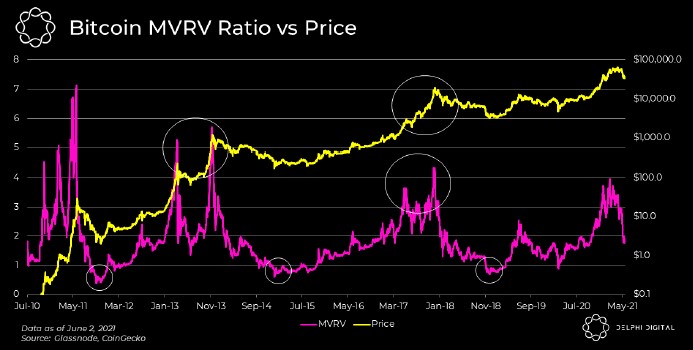 Delphi Digital tarafından yayımlanan rapordaki MVRV oranı ise Bitcoin için düşüşün bittiğini gösteriyor olabilir. Bitcoin’in piyasa değerini (MV), realize edilen değeri (RV) ile kıyaslayan bu indikatör, yatırımcıların düşüş ve yükseliş konusunda ne düşündüğünü de gösteriyor. MVRV grafiğine bakıldığında ise mevcut durumun aslında 2017 yılında da yaşandığı görülebilmekte. Bunun devamında ise önemli bir yükseliş yaşanıyor ve BTC tüm zamanların rekorunu kırıyor.