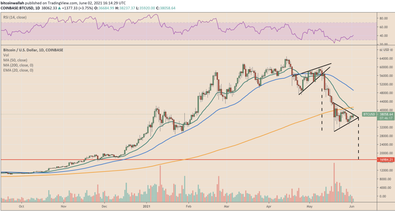 Kripto para analisti Bitcoin Wallah, Tradingview üzerinden yayınladığı görselinde aslında düşüşün henüz bitmemiş olabileceğini vurguladı. Analistin yayımladığı grafiğe bakıldığında, 16.000 dolar seviyesinin “en kötü senaryo” olduğu görülüyor. Bitcoin’in bu fiyata kadar düşmesi kesin olmasa da analist her duruma karşı hazırlıklı olunmasını vurgulayarak sert iğnelerin gelebileceği konusunda yatırımcıları uyardı.
