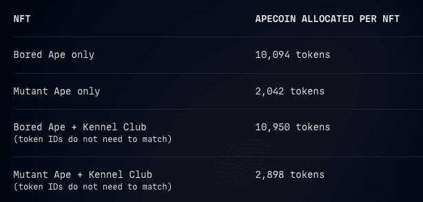 ApeCoin’in resmi sitesinde paylaşılan bilgilere göre, Bored Ape Yacht Club (BAYC) NFT sahiplerine NFT başına 10.094 ApeCoin dağıtılırken, Mutant Ape Yacht Club (MAYC) NFT yatırımcılarına ise NFT başına 2.042 adet ApeCoin dağıtıldı.