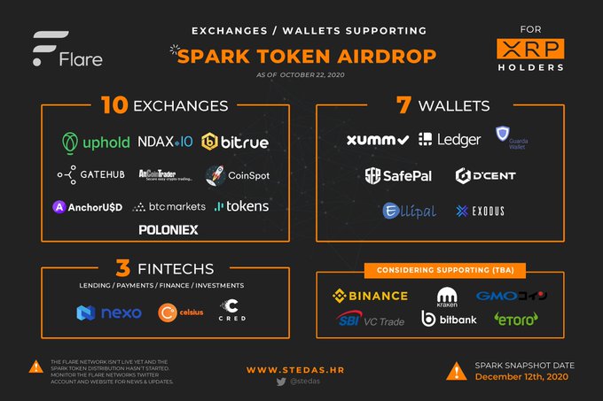 XRP sahiplerine 12 Aralık 2020’de ücretsiz olarak ellerinde tuttukları XRP miktarı kadar Spark Token hediye edilecek. Şu anlık bu airdropu destekleyen 10 tane kripto para borsası bulunmakta.