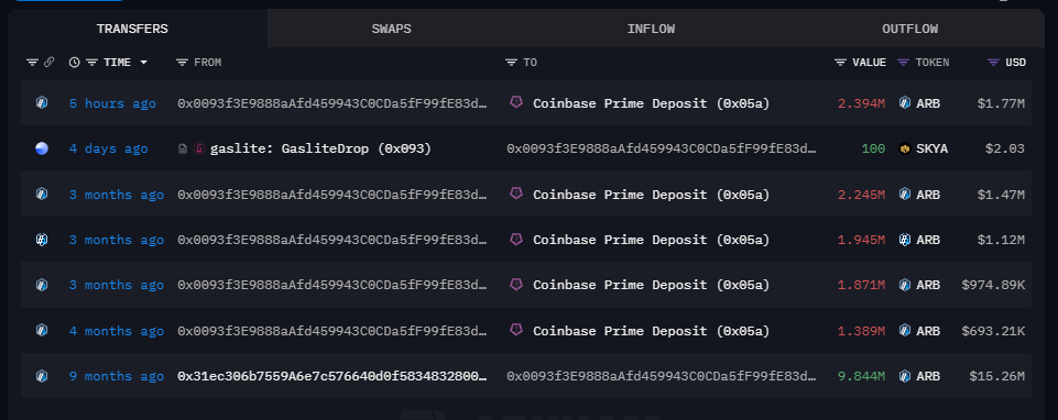 9 ay önce, bu cüzdan 9.844M adet ARB (15.26M dolar değerinde) aldı ve hepsini satış için Coinbase’e yatırdı.