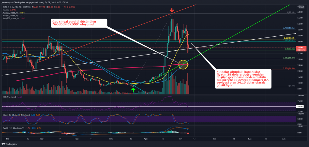 Performansıyla yatırımcıların gözünü büyüleyen ve son düşüşüyle yatırımcılara tedirginlik veren AVAX’ın günlük grafiğinde “Altın Kesişim” olarak bilinen ve yükselişe işaret eden “Golden Cross” görünümü bulunuyor.