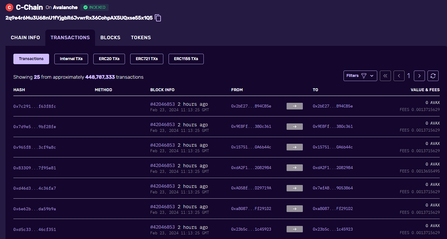 Avascan tarayıcısı, Avalanche C-Chain’in son işleminin 42046853 (19:13 UTC+ 8) bloğunda kaldığını gösteriyor. Diğer alt ağlarda ise hafif bir gecikme olduğu gözlenmekte.
