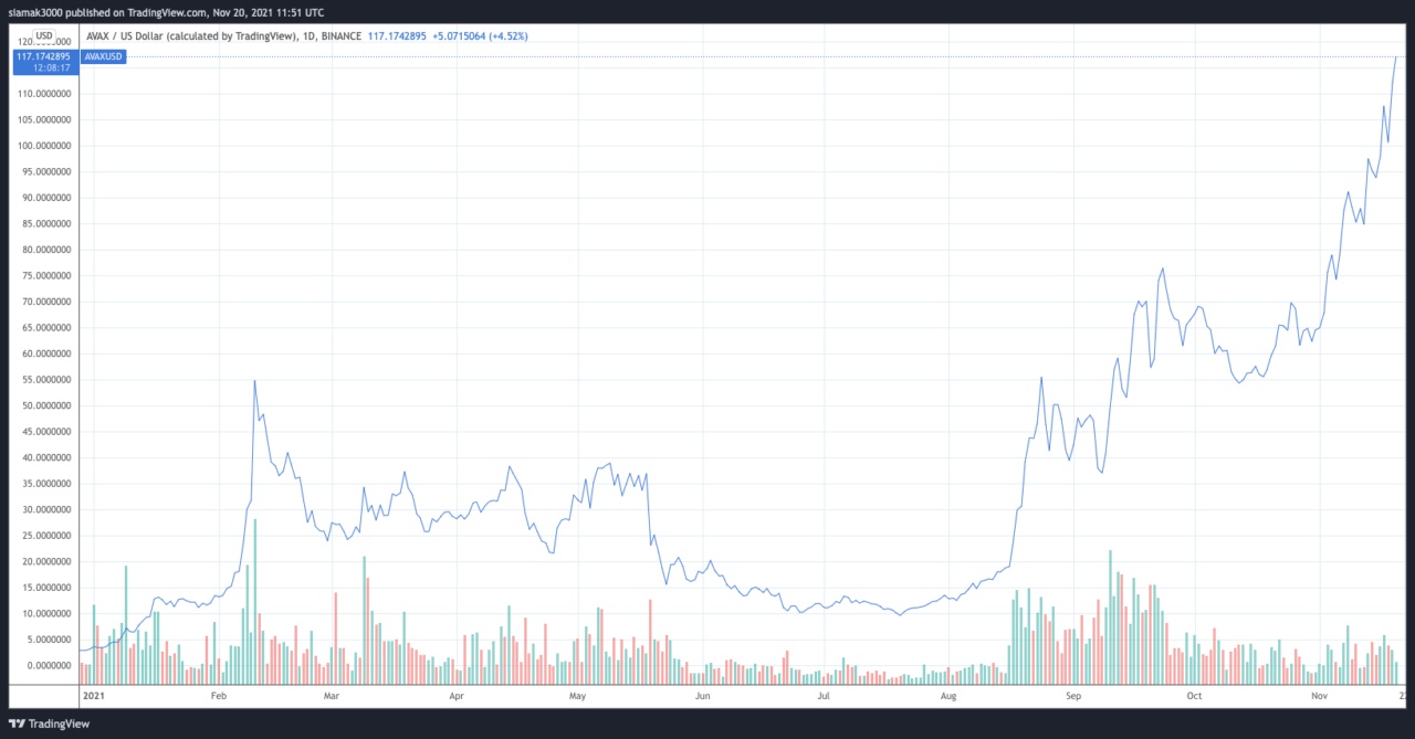 AVAX yıl başından bu yana %3576 artış ile muazzam fiyata çıkmayı başardı. Yayın saati ile AVAX fiyatı %10 artış ile 118 dolar civarında işlem görüyor.