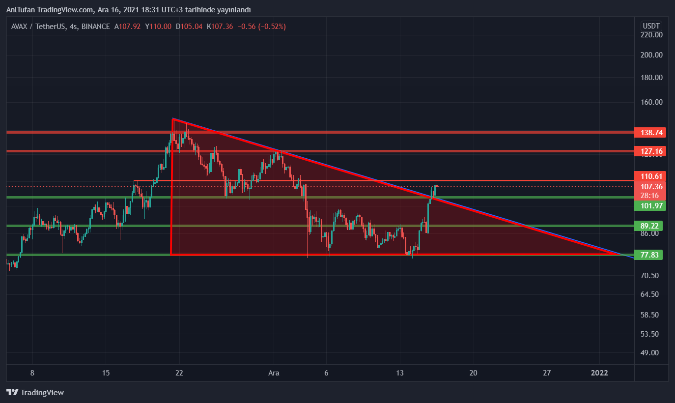 Yayın saati itibariyle 106.4 dolar seviyelerinde bulunan AVAX, düşen trendini yukarı yönlü kırmış durumda. Daha küçük saat grafiklerinde baktığımızda; minor düşen trendlerini kırıp sert yükselen AVAX, major düşen trendini de kırdı.