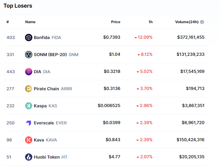 Başarılı bir veri sağlayıcısı olan CoinMarketCap’in aktardıklarına göre, son 1 saat içerisinde altcoin’ler yüzde 2 – 4 oranında değer kaybetti.