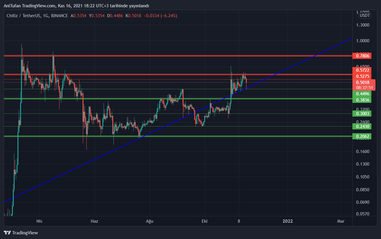 Piyasaya çıkardığı fan tokenler ile birlikte değerine değer katan CHZ, 0.44 dolar ara desteği CHZ’yi desteklemeye devam ediyor. Okurlarımız aşağıda bulunan grafikte belirttiğimiz yeşil destek seviyelerinden alım yapabilir ve kırmızı direnç seviyelerinden kâr satışı gerçekleştirebilirler.