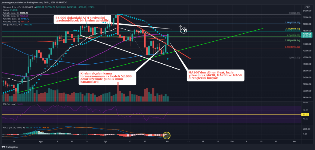 Eylül ayı başında 52.920 dolara kadar yükselen ve ardından hızla bir düşüş trendine giren BTC, yeni ayın ilk günüyle birlikte bu düşen trendi kırmayı başarıyor.