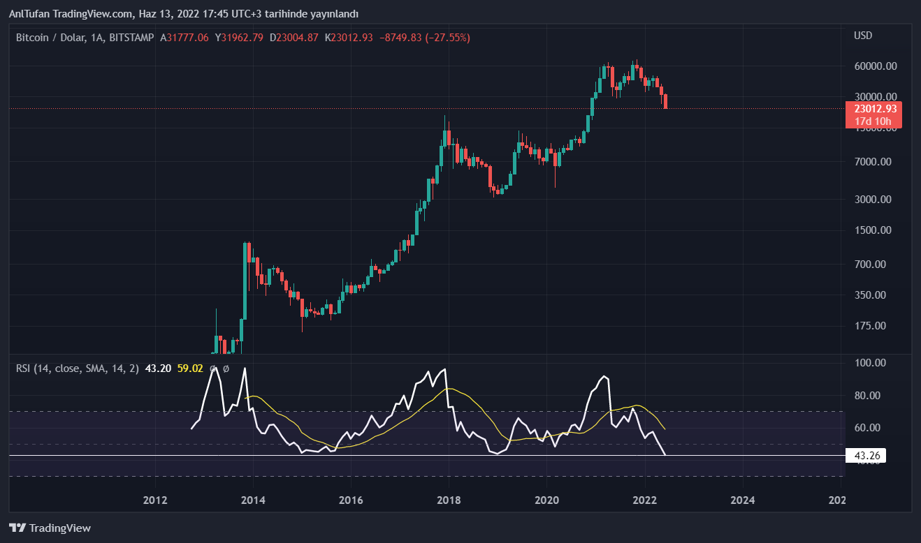 En eski indikatörlerinden bir tanesi olan Göreceli Güç Endeksi (RSI), aylık grafikte Bitcoin tarihinin bu zamana kadar görmediği bir seviye olan 43.26’ya ulaştı.