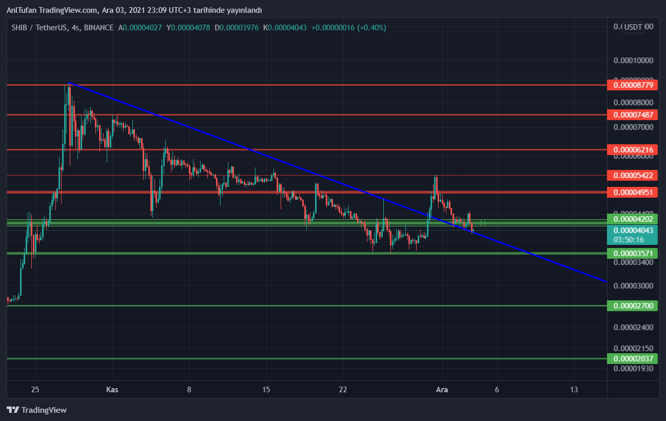 4 saatlik grafikte baktığımızda 0.00004110- 0.00004270 dolar desteğinin altına sarktığını gördüğümüz Shiba Inu, geçtiğimiz günlerde kırdığı düşen trend çizgisinden destek görmeye devam ediyor.