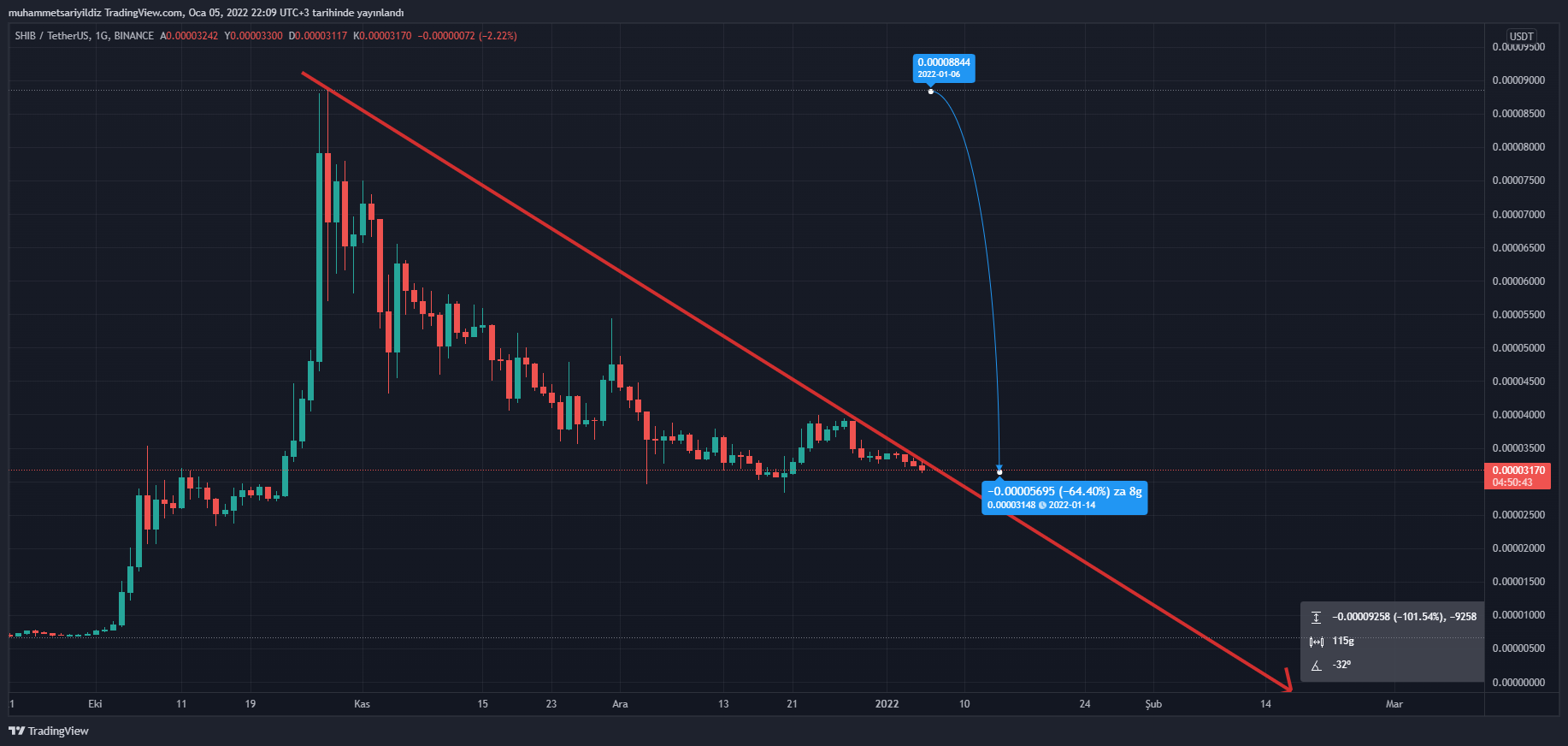 Bitcoin ve kripto para piyasasındaki durgunluğun etkisine kapılan Shiba Inu, son zamanlarda pozitif bir performans gösteremiyor. Popüler meme coin tüm zamanların en yüksek seviyesi olan 0.00008854 dolar seviyesinden %65 geride bulunuyor ve bu başlayan düşen trend çizgisinden şaşmadan, aşağı yönlü hareketine devam ediyor.