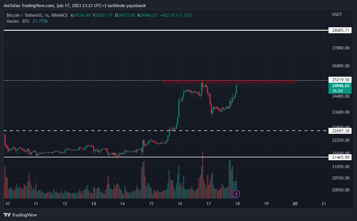 Önümüzdeki saatlerde Bitcoin’in satıcı baskısını kırması halinde 25 bin doları aşıp 28 bin dolara yükselmesi bekleniyor. 25 bin doların aşılamaması ise 22.700 dolara bir geri çekilme yaşanmasına neden olabilir.