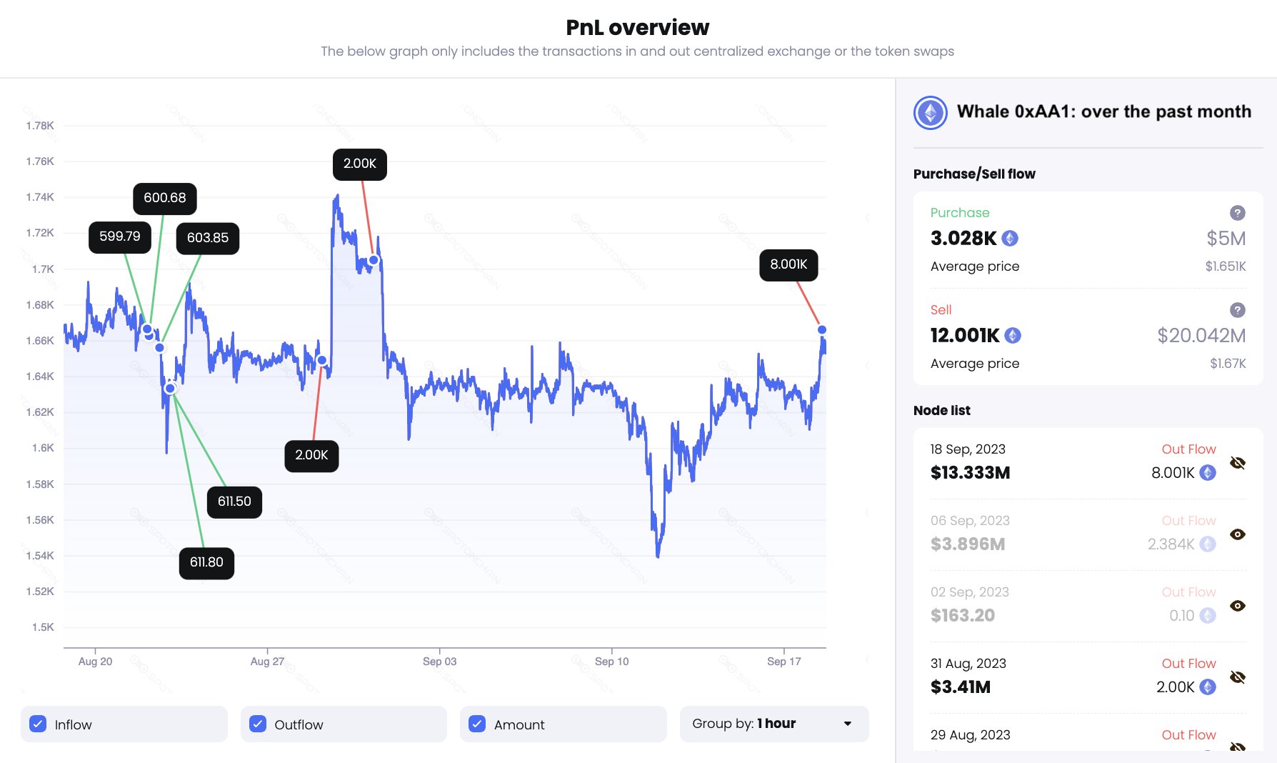 - 29 Ağustos’tan beri 1.670 dolar ortalamasıyla Binance’den toplamda 12,000 adet ETH satmış (20 milyon dolar değerinde). Bu balina şu anda 10.9 bin adet ETH (18 milyon dolar) tutuyor.