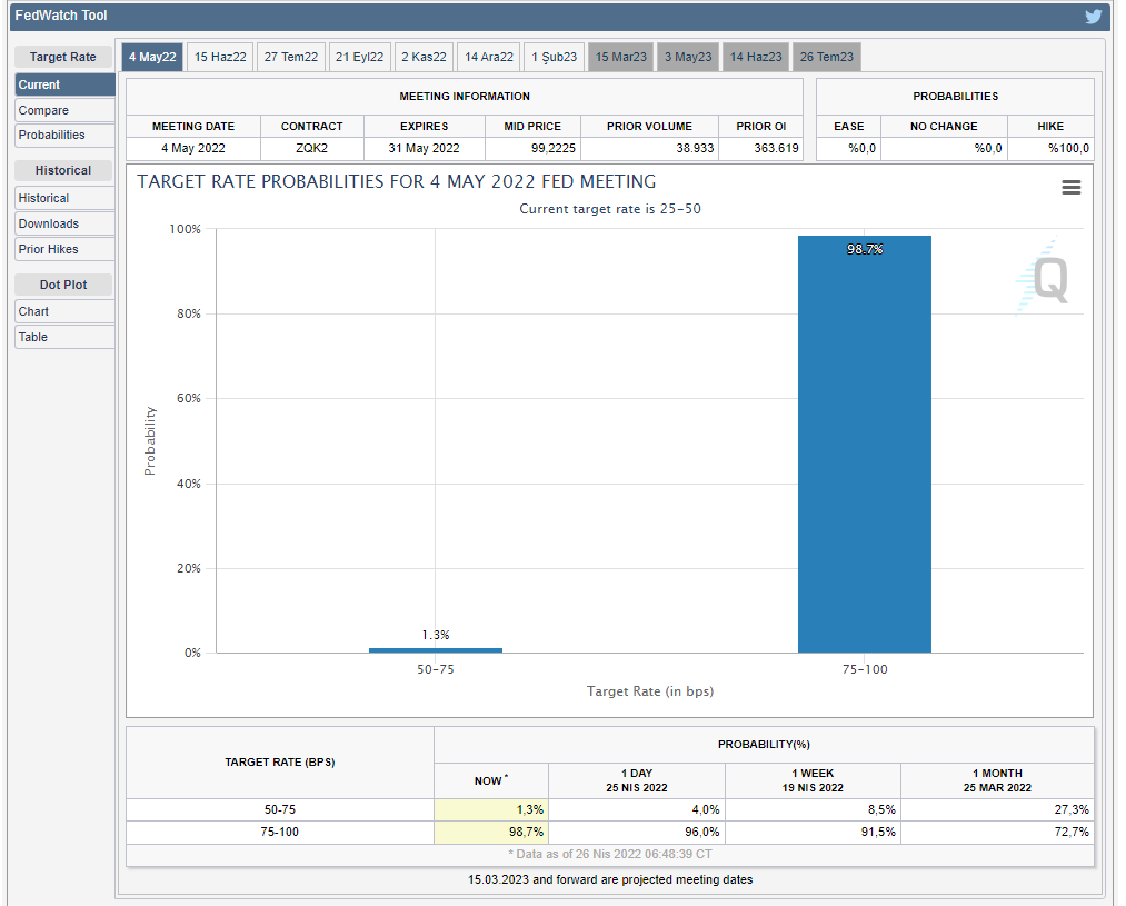 CME Group’un aktardığı verilere göre piyasalar şuanda 75 baz puanlık faiz artışını dahi fiyatlamış olabilir.