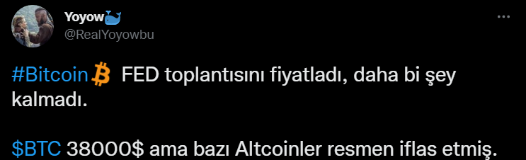 Bitcoin ve kripto paraların bu toplantıdan çıkacak her kararı fiyatladığını aktaran ünlü Türk balina, altcoinlerin iflas ettiğini vurguluyor.