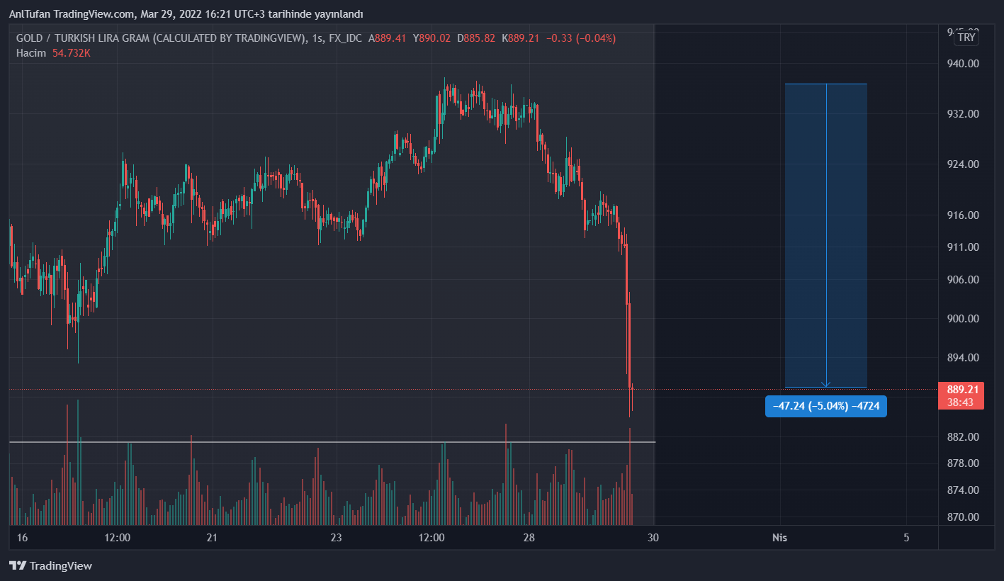 %5’ten fazla düşüş yaşayan gram altın, halen 880 Türk lirası desteği üzerinde tutunmaya çalışıyor gibi gözükmekte.