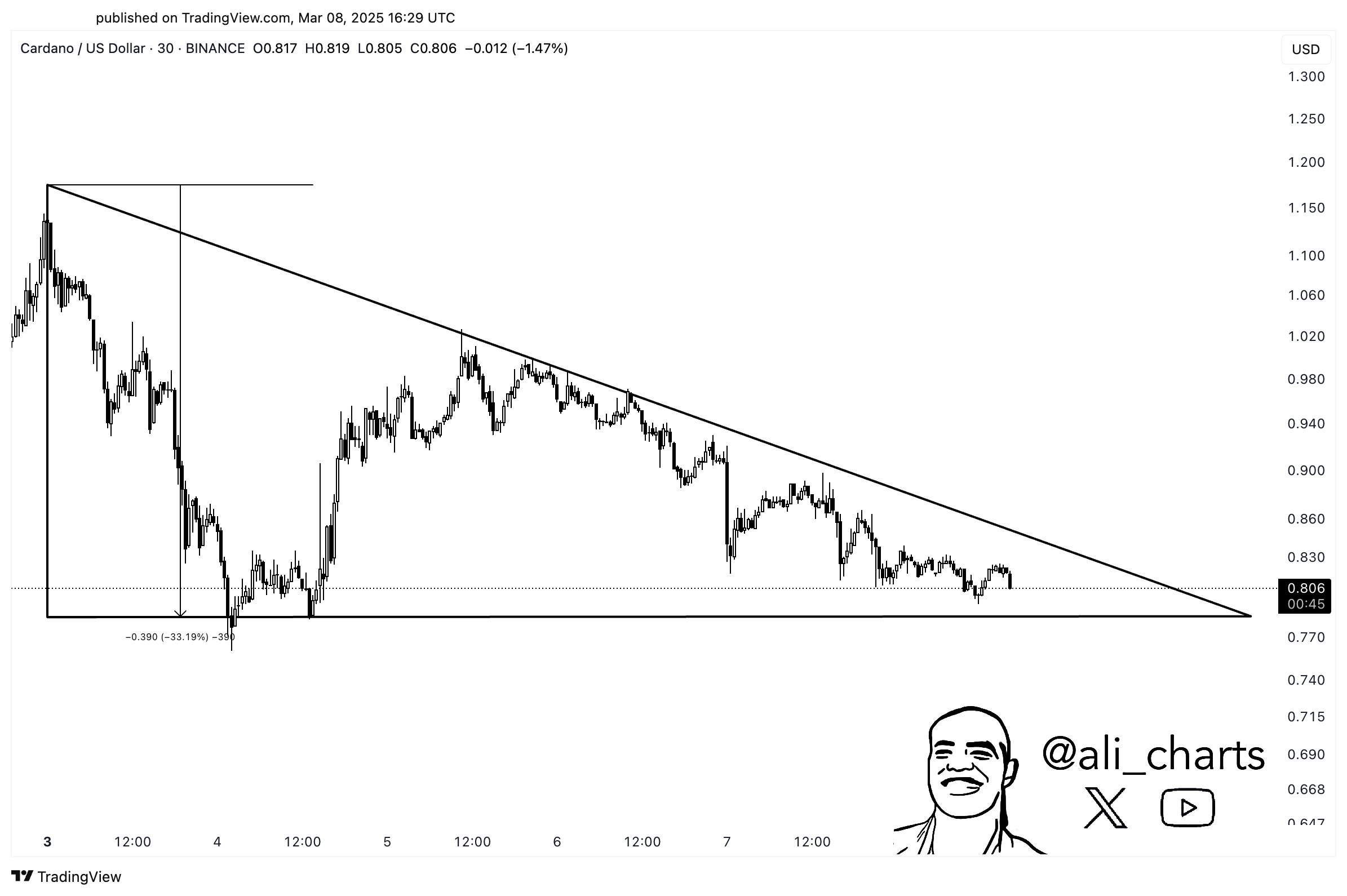 Martinez’in paylaştığı ADA alçalan üçgen formasyonuna baktığımızda, bu formasyondaki düşen trendin birçok kez test edilerek onaylandığı görülebiliyor.