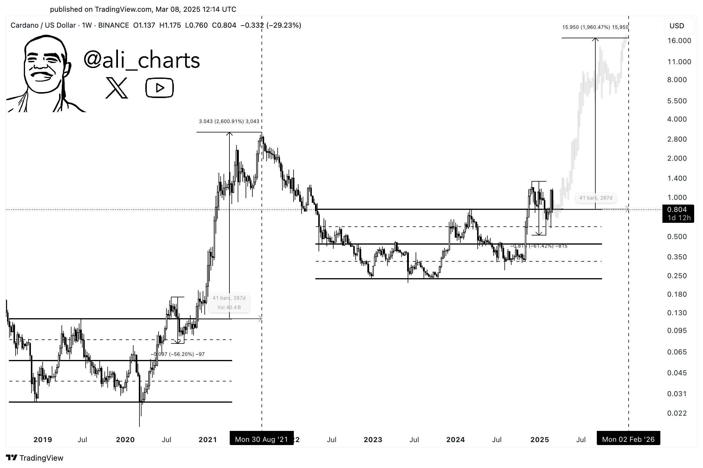 Son dönemde genellikle başarılı tahminlerde bulunan Ali Martinez, ADA’nın boğa sonuna kadar 20 kat yükselebileceğini düşünüyor. İşte Martinez’in son paylaştığı analizde yer alan detaylar: