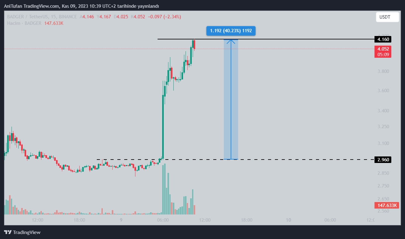 Dakikalar içerisinde %40’lık bir artış yaşayan BADGER, an itibariyle 4 doların üzerinde işlem görüyor. BADGER’ın 4 doların altına sarkmaması, yükselişlerin devam etmesini sağlayabilir.