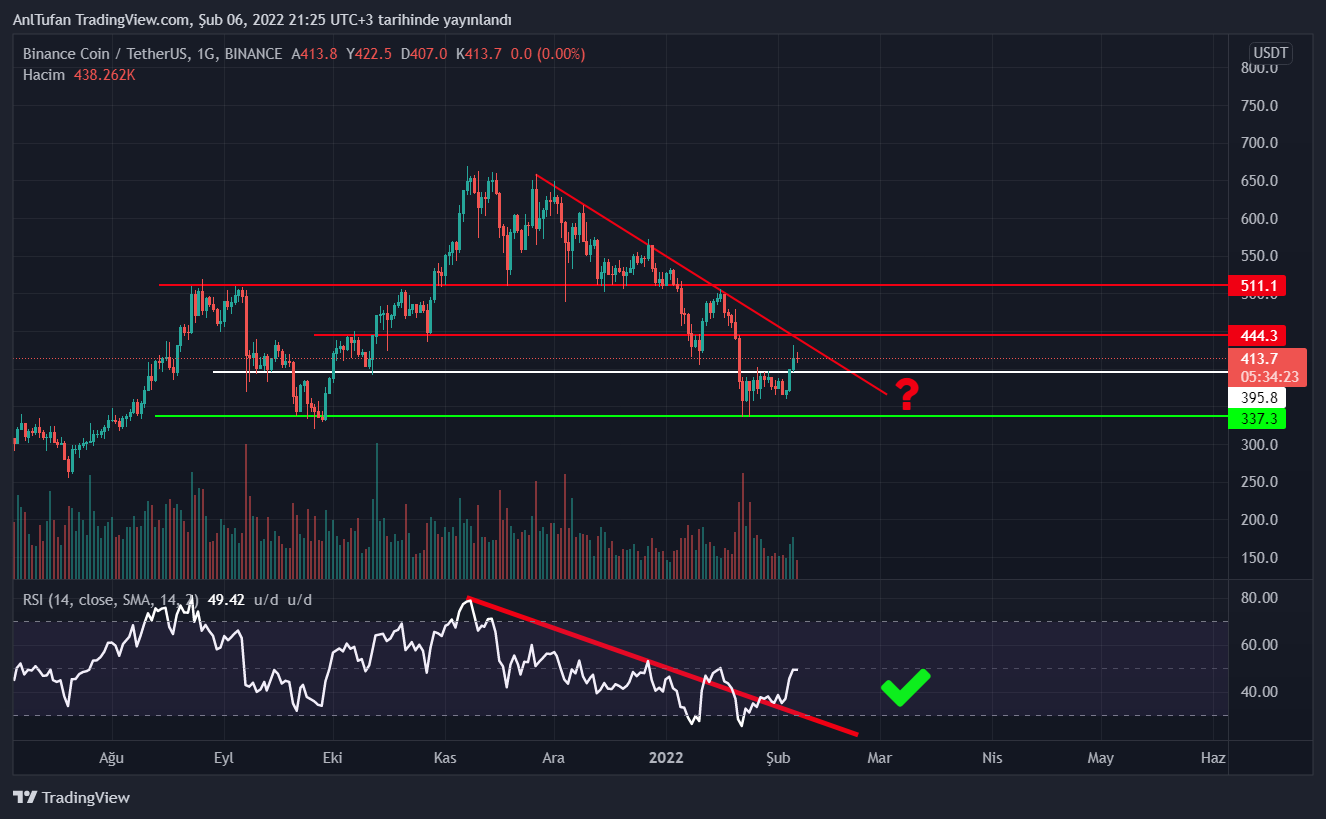 Yayın saati itibariyle 413 dolar seviyelerinde bulunan BNB, RSI indikatörü üzerinde düşen trendi kırmış durumda. Fiyat grafiğinde halen düşen trendini kıramamış olan BNB, ilk yükseliş sinyalini verdi.