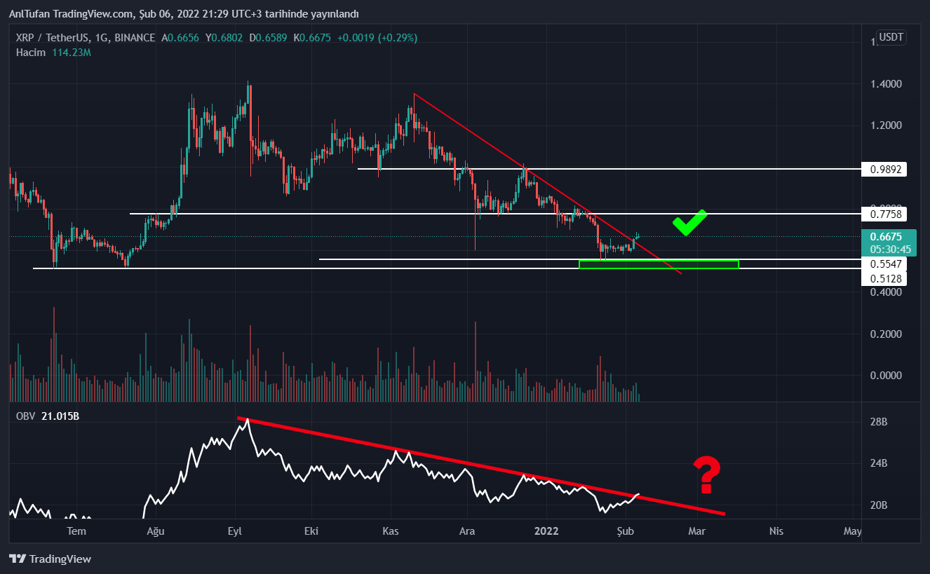 OBV’de bulunan düşen trendini kırmasıyla sert bir hareket yapabilecek olan XRP, düşen trendini kıramaması durumunda ise burda yaşadığı trend kırılımına da bir “fakeout” diyebiliriz.