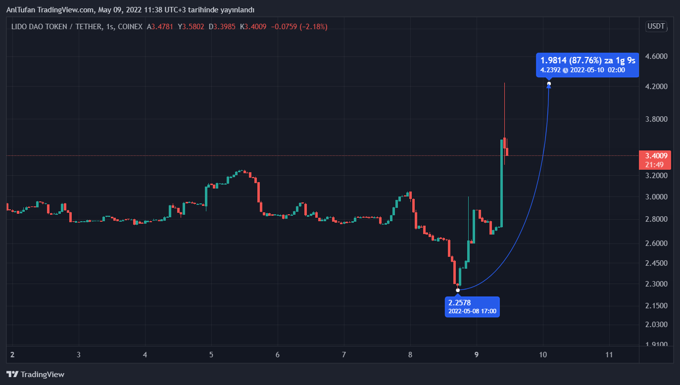 Her ne kadar kripto piyasası kötü gitmesine rağmen LDO‘nun yükseliş yaşaması göze çarpmakta. LDO, listeleme haberi ve gelişmeleri ardından %87 oranında bir yükseliş gerçekleştirdi.