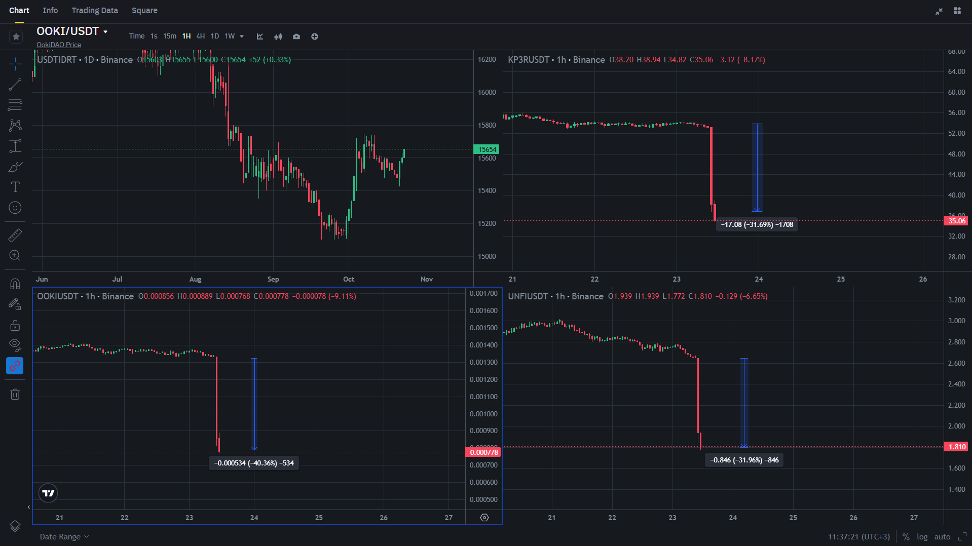 IDRT, KP3R, OOKI ve UNFI isimli 4 altcoin‘i delist eden Binance, bu ürünlerde çöküş getirdi. Binance’in delist kararı sonrasında IDRT haricindeki 3 altcoin’de ortalama %30 – %40’lık ani düşüşler yaşandı. IDRT olarak işlem gören kripto varlık ise Endonezya Rupiah’sıdır.