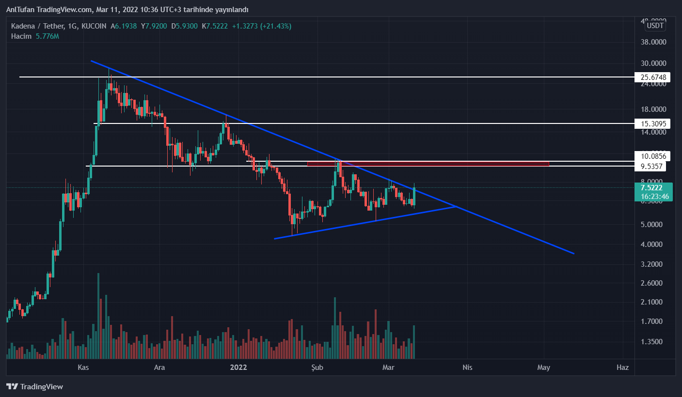 7.35 – 7.50 dolar üzerinde 4 saatlik kapanış yapmasının ardından hızlı bir şekilde 9.50 – 10.00 dolar seviyelerine ulaşabilecek olan Kadena, böyle bir yükseliş yapması halinde bugün itibariyle %71 oranında yükselmiş olacak.