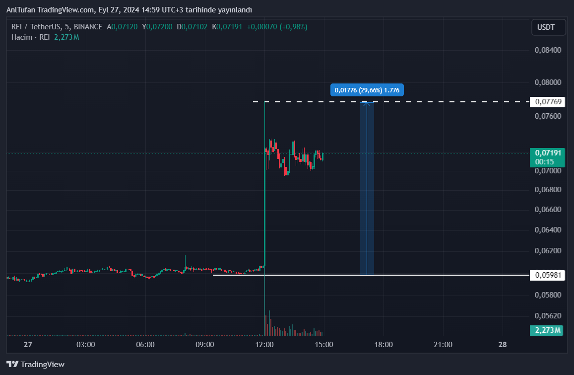 Binance’in son gelen vadeli müjdesi ile birlikte REI isimli altcoin’de ani yükseliş yaşandı. REI son dakikalarda %35 oranında değer kazanarak dikkatleri üzerine çekmeyi başardı.