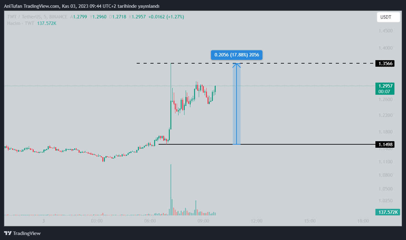 Çok kısa bir süre içerisinde %20’ye yakın bir yükseliş gerçekleştiren TWT, dikkatleri üzerine çekti. Önümüzdeki saatlerde Bitcoin’in de toparlanması, TWT’de çok daha büyük yükselişlerin yaşanmasını sağlayabilir.