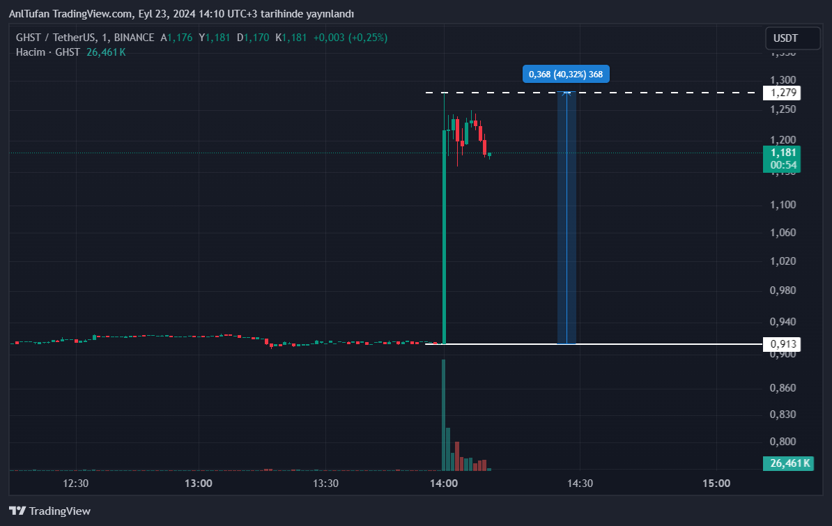 Geçtiğimiz dakikalarda ise Binance GHST isimli altcoin’i vadeli piyasada listeleme kararı aldı. Bu son listeleme hamlesi ile birlikte ise GHST fiyatında %40’lık sert bir yükseliş meydana geldi.