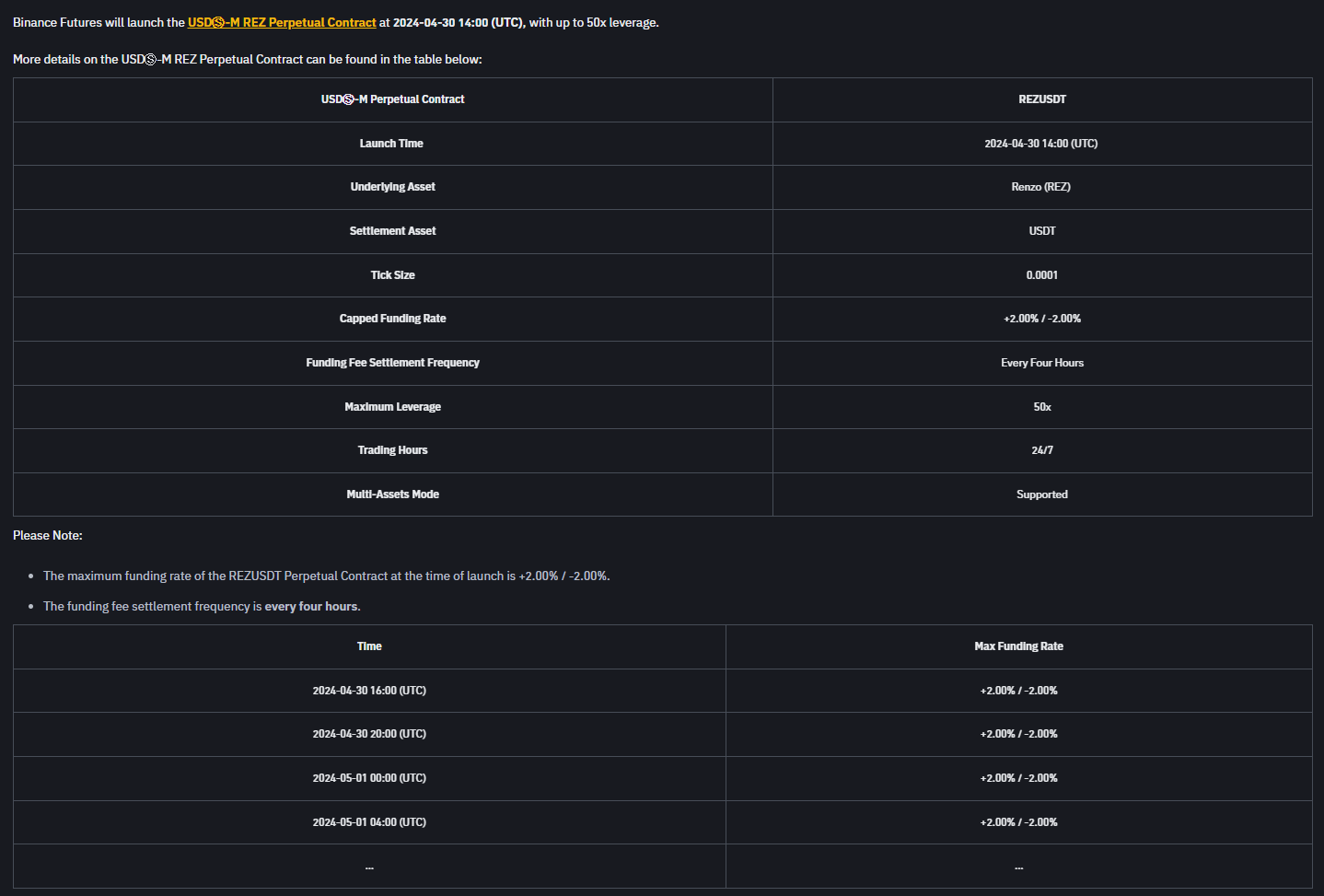 - Binance Vadeli İşlemler, 50 katına kadar kaldıraçla USDⓈ-M REZ Sürekli Sözleşmesini başlatacak.