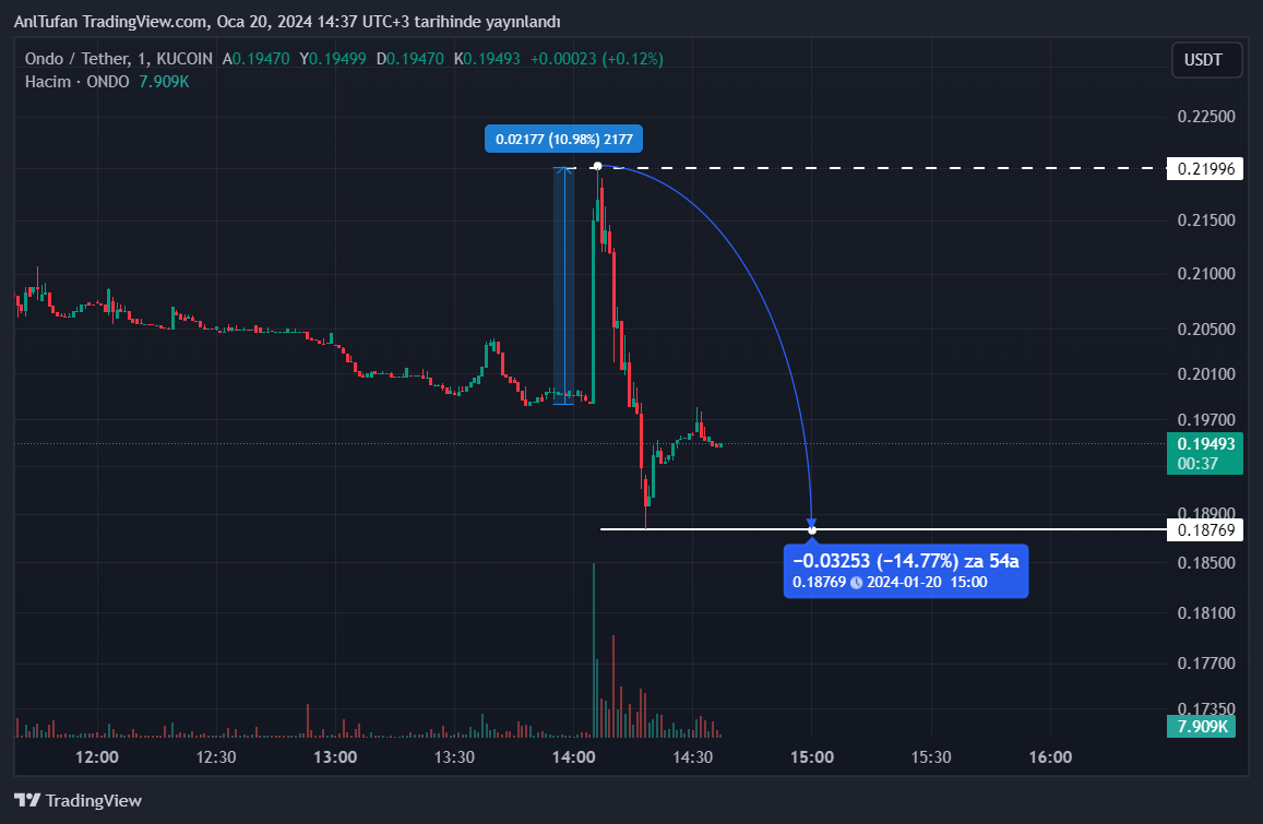 0.219 dolar seviyelerinde zirve yapan ONDO, kısa bir süre içerisinde 0.187 dolar seviyelerine kadar %15’lik bir düşüş yaşadı.