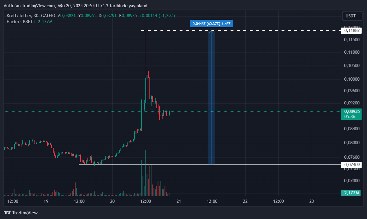 BRETT 19 Ağustos akşam saatlerine doğru sert yükselişler gerçekleştirmeye başlamıştı. Binance’in vadeli listelemesi sonucunda bu rallinin daha da alevlendiği görüldü.